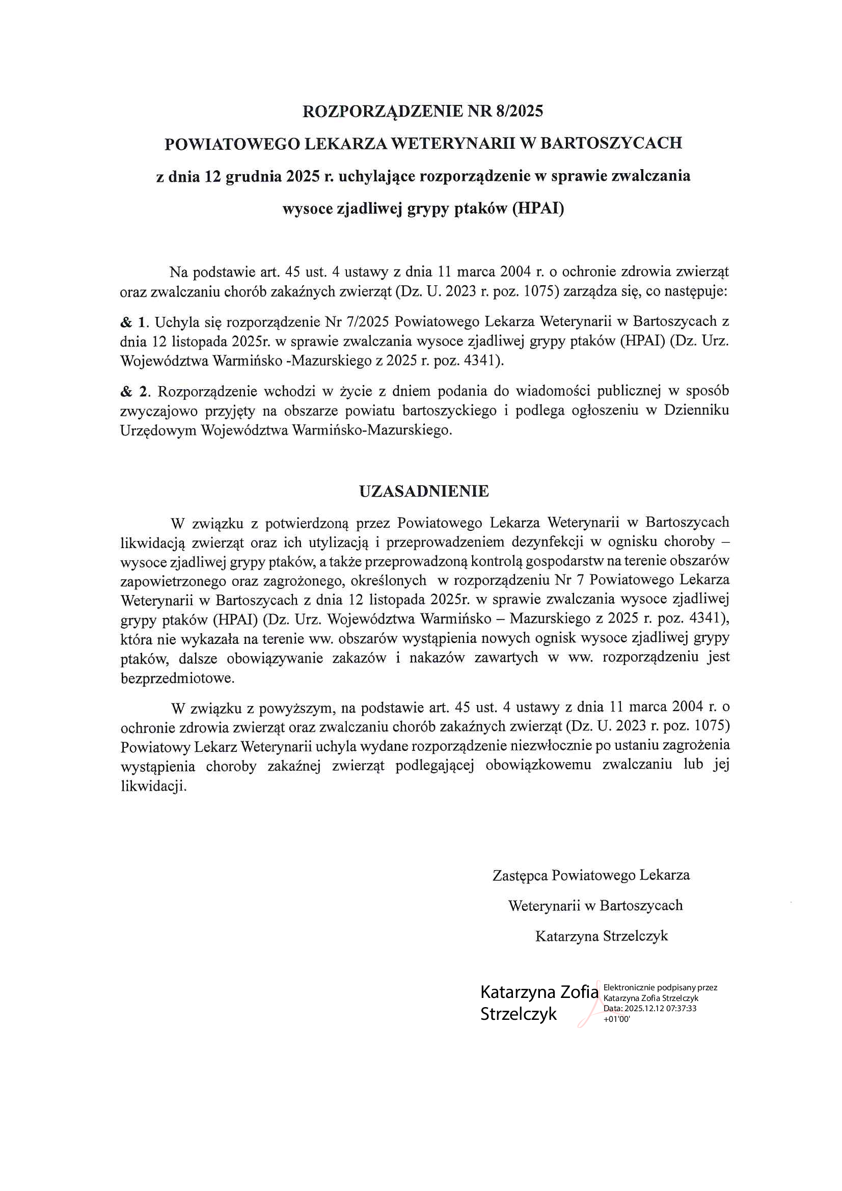 12 grudnia br. do Urzędu Miejskiego w Sępopolu wpłynęła informacja od Powiatowego Lekarza Weterynarii w Bartoszycach, uchylająca rozporządzenie nr 7/2025 w sprawie zwalczania wysoce zjadliwej grypy ptaków (HPAI). Treść poniżej.