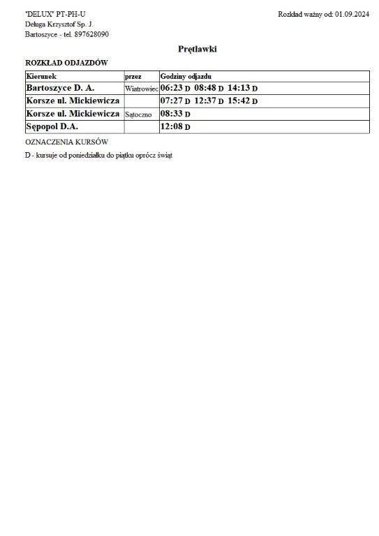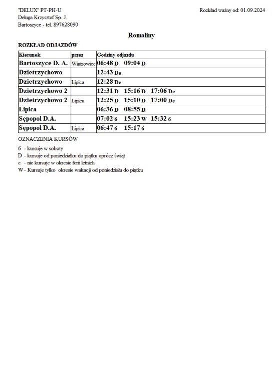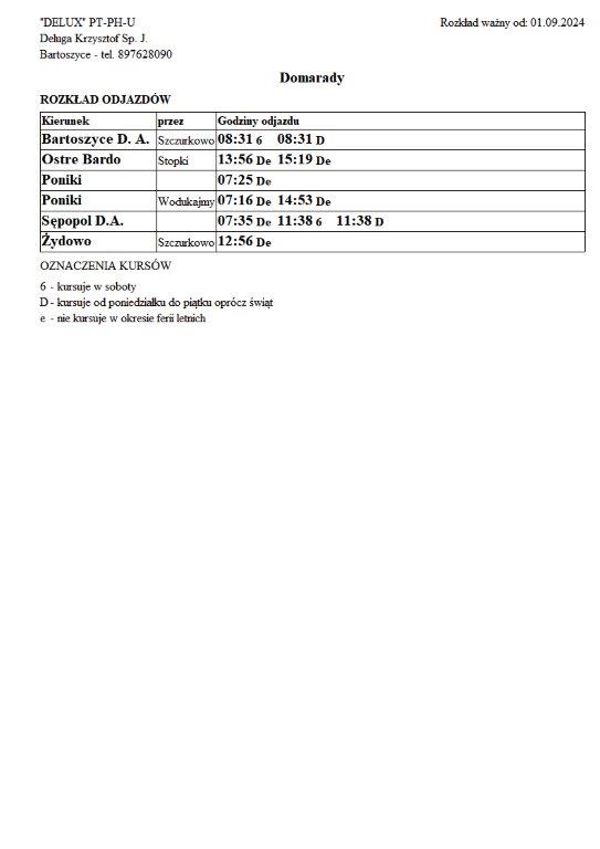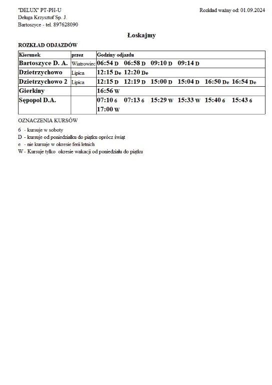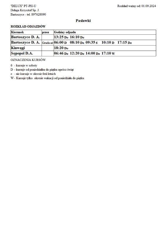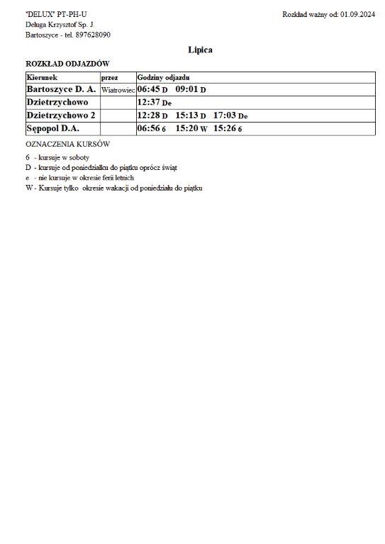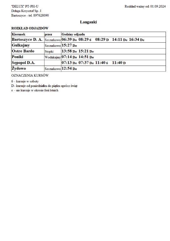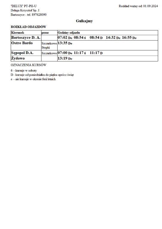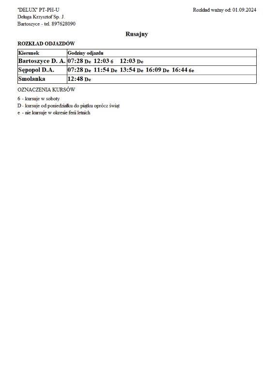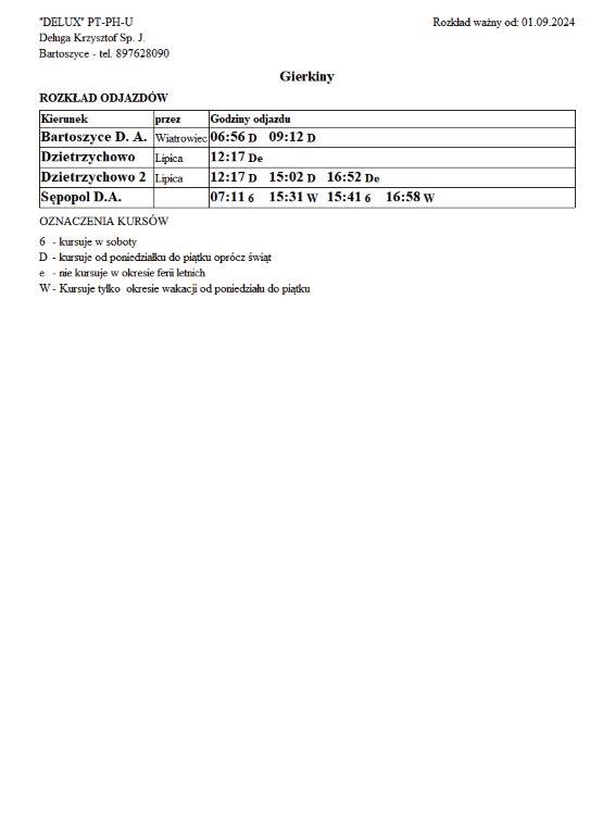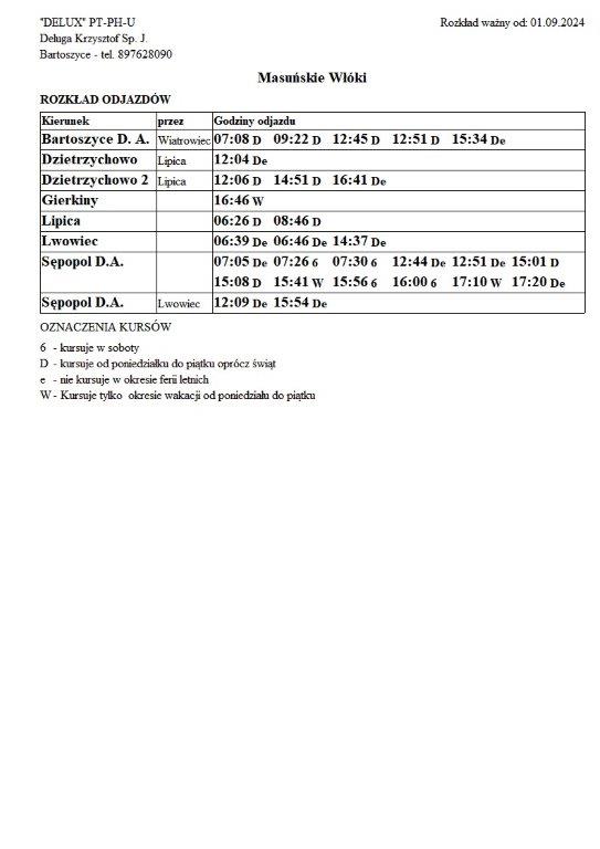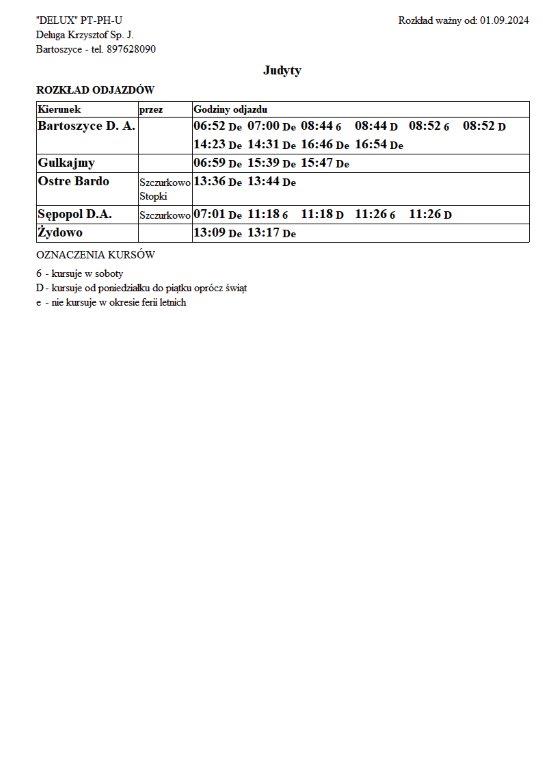 Firma Delux z Bartoszyc, świadcząca usługi komunikacji publicznej na terenie powiatu, udostępniła rozkłady jazdy z obszaru naszej gminy w formie plików graficznych. Zainteresowane osoby mogą teraz pobrać i przeglądać aktualne rozkłady kursów autobusowych na swoich urządzeniach. Aktualizowane pliki dostępne są również na stronie przewoźnika, co ułatwia śledzenie ewentualnych korekt i bieżących zmian w rozkładach.