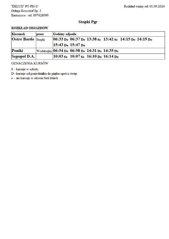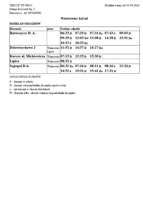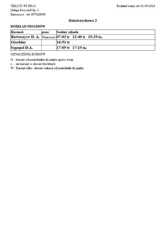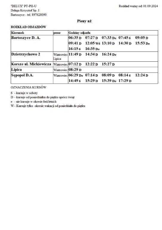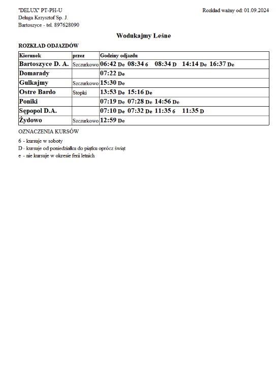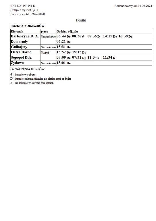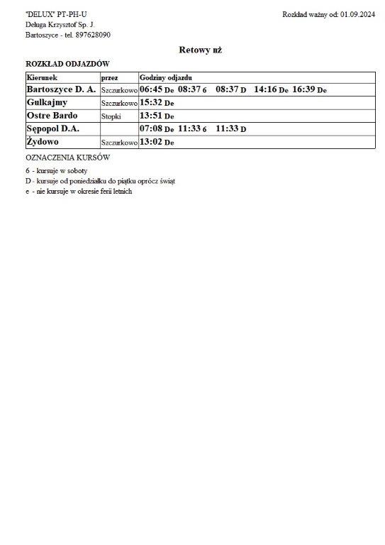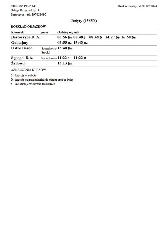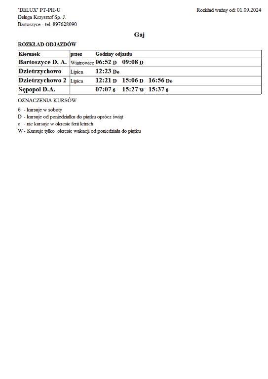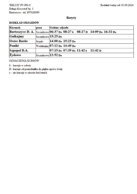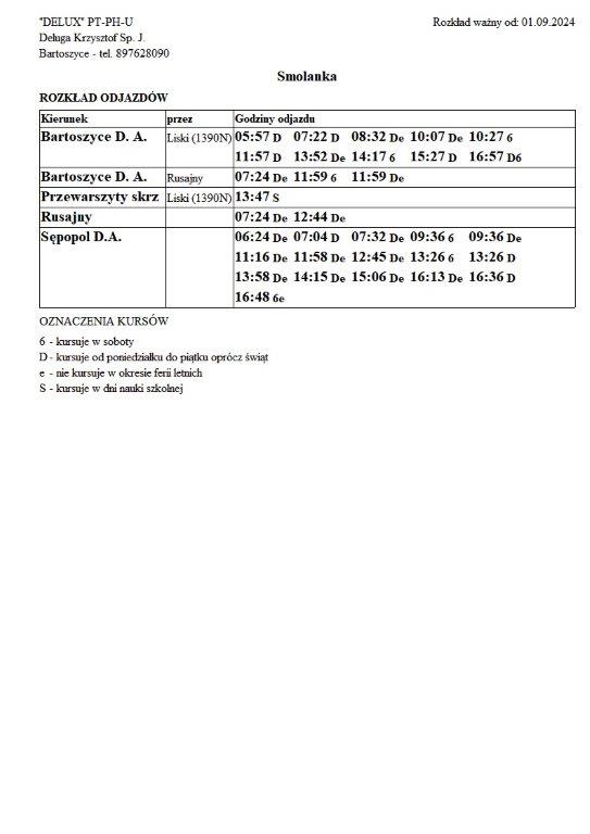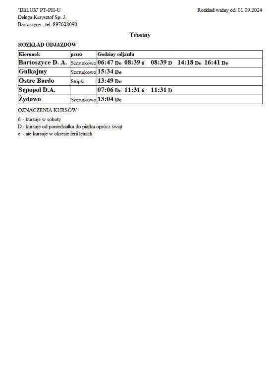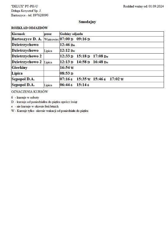 Firma Delux z Bartoszyc, świadcząca usługi komunikacji publicznej na terenie powiatu, udostępniła rozkłady jazdy z obszaru naszej gminy w formie plików graficznych. Zainteresowane osoby mogą teraz pobrać i przeglądać aktualne rozkłady kursów autobusowych na swoich urządzeniach. Aktualizowane pliki dostępne są również na stronie przewoźnika, co ułatwia śledzenie ewentualnych korekt i bieżących zmian w rozkładach.