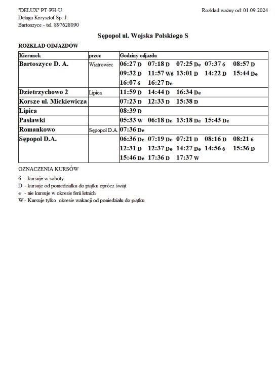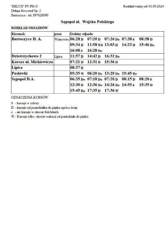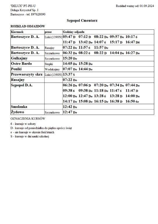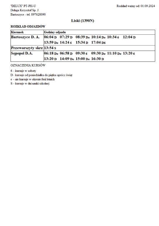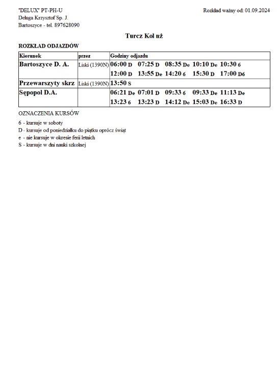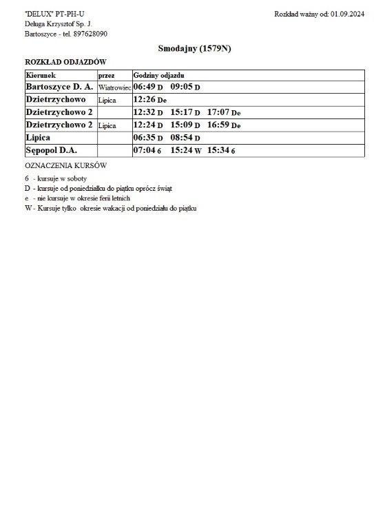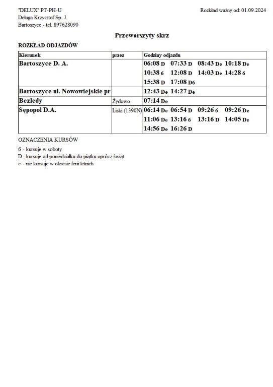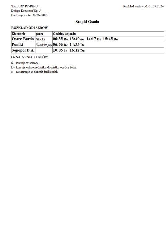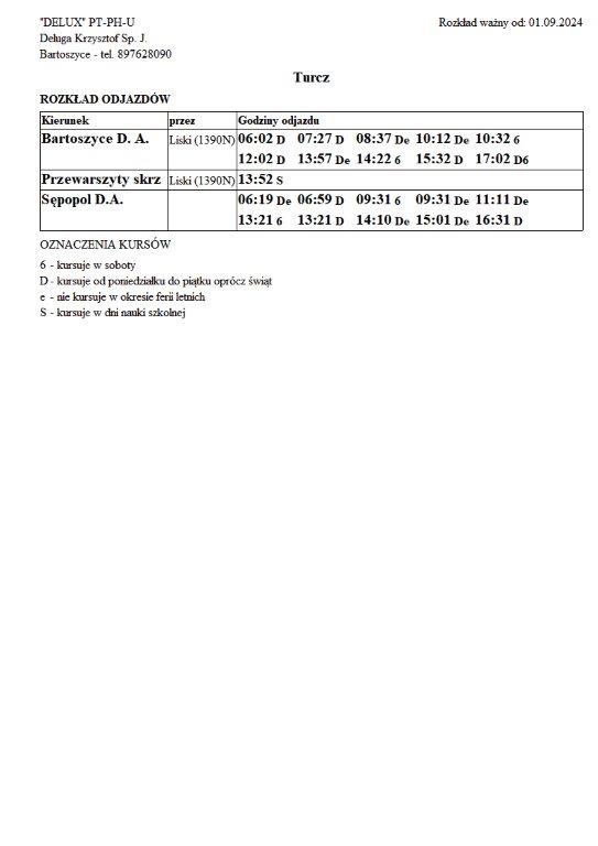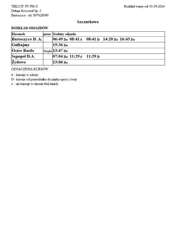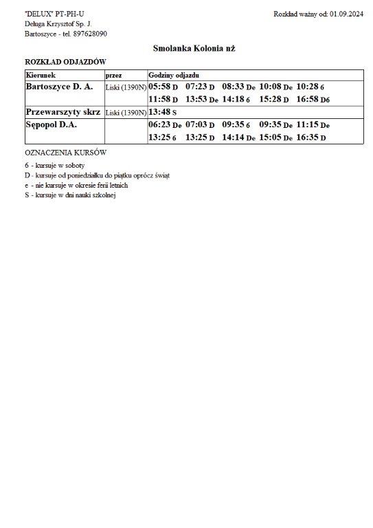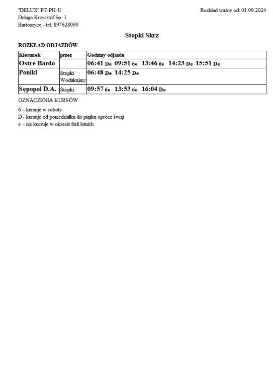 Firma Delux z Bartoszyc, świadcząca usługi komunikacji publicznej na terenie powiatu, udostępniła rozkłady jazdy z obszaru naszej gminy w formie plików graficznych. Zainteresowane osoby mogą teraz pobrać i przeglądać aktualne rozkłady kursów autobusowych na swoich urządzeniach. Aktualizowane pliki dostępne są również na stronie przewoźnika, co ułatwia śledzenie ewentualnych korekt i bieżących zmian w rozkładach.