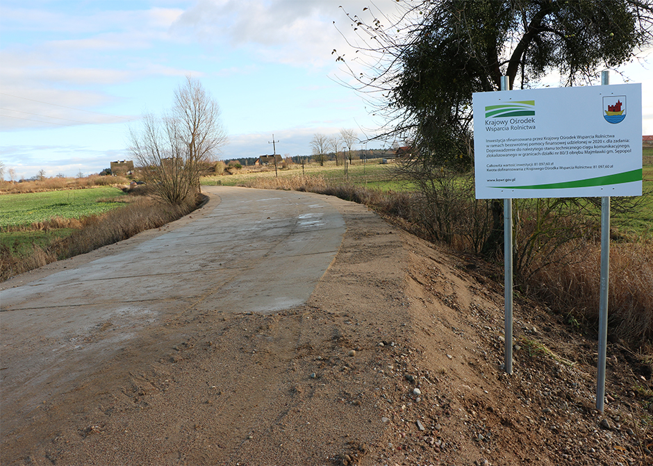 Za wsparcie dziękujemy władzom Krajowego Ośrodka Wsparcia Rolnictwa z Olsztyna, bez którego duża część inwestycji realizowanych na terenie naszej gminy nie mogłaby dojść do skutku. Do przebudowy jest jeszcze bardzo wiele dróg (cała sieć dróg gminnych to ponad 300 km), ale nie na wszystkie drogi, które powinny być wykonane w pierwszej kolejności, można uzyskać zewnętrzne środki. Niestety gmina nie posiada wystarczających dochodów by wykonywać prace z własnych środków, dlatego też, jedynym rozwiązaniem naprawy dróg gruntowych jest szukanie wsparcia we wszelkich instytucjach które mogą sfinansować inwestycje. Tak też staramy się robić.