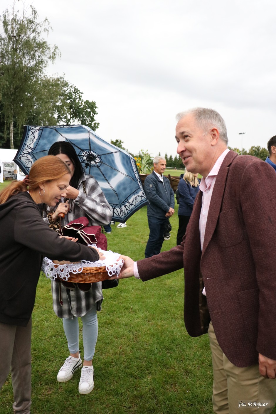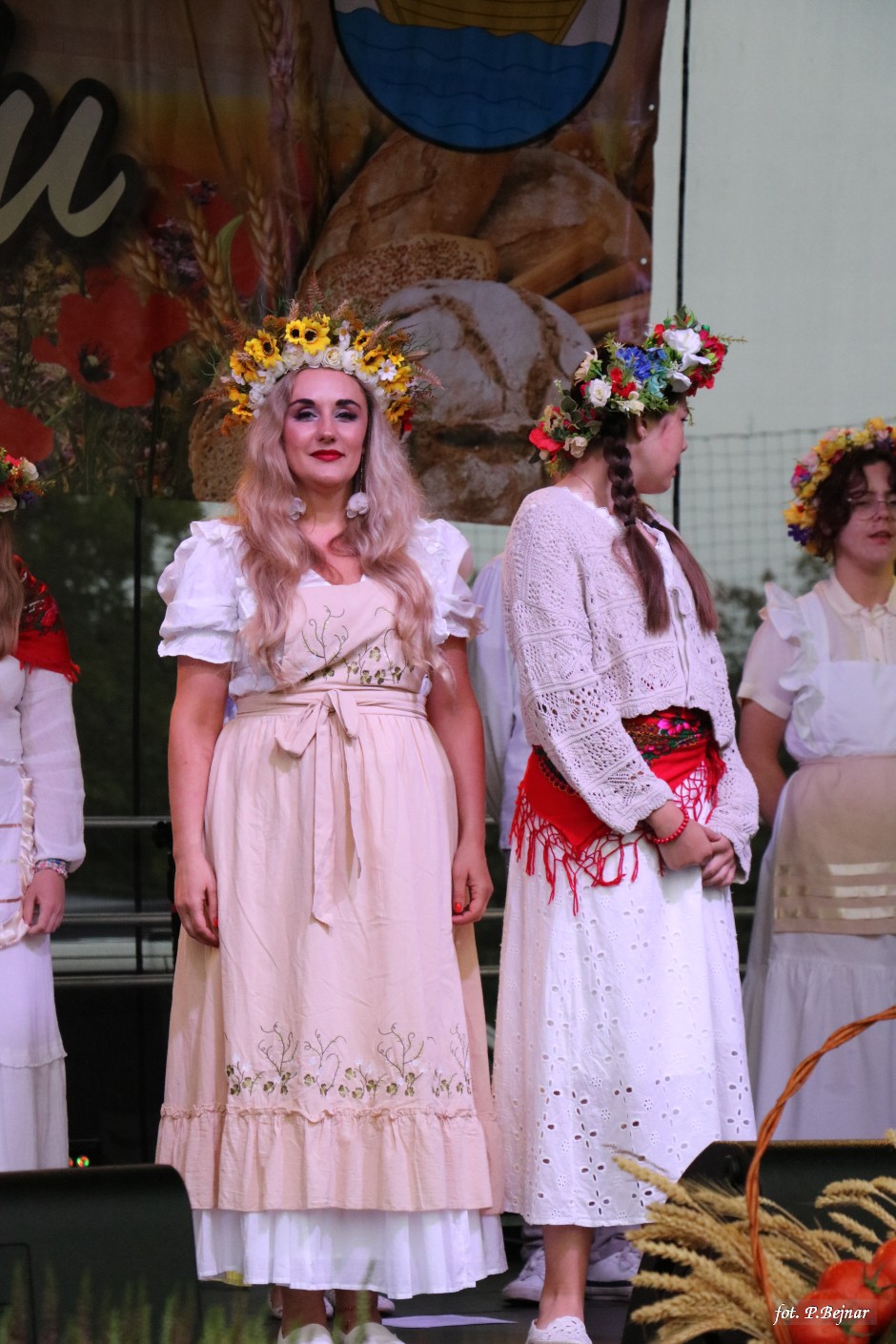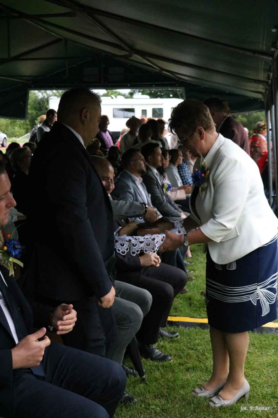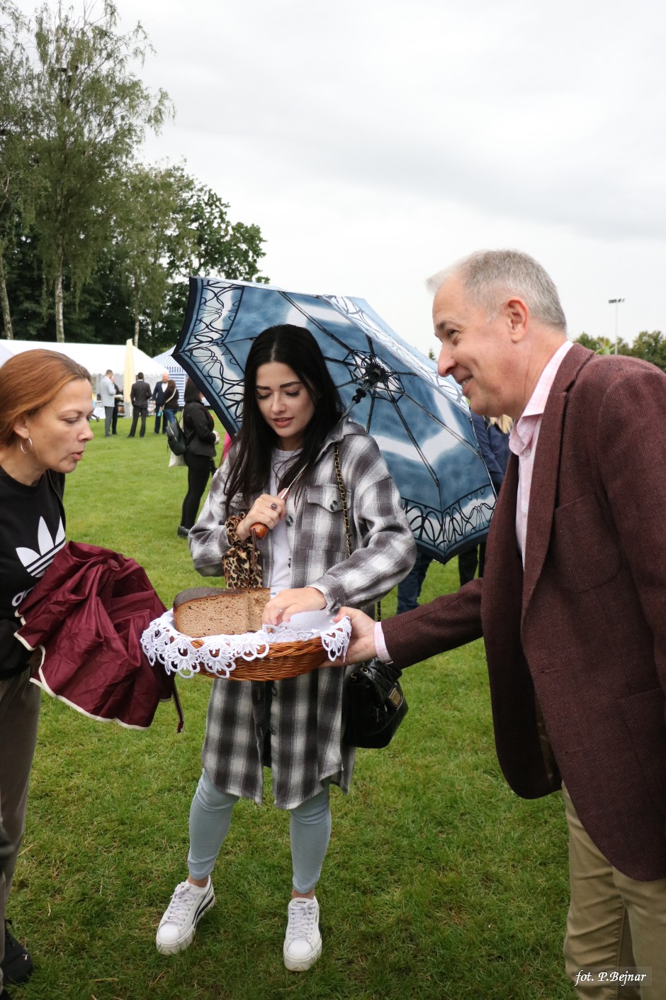 Jednym z najbardziej podniosłych momentów było dzielenie się chlebem – symbolizującym dostatek i jedność wspólnoty. Starostowie Dożynek przekazali bochen Pani Burmistrz Irenie Wołosiuk, która następnie rozdzieliła go pomiędzy wszystkich uczestników uroczystości.