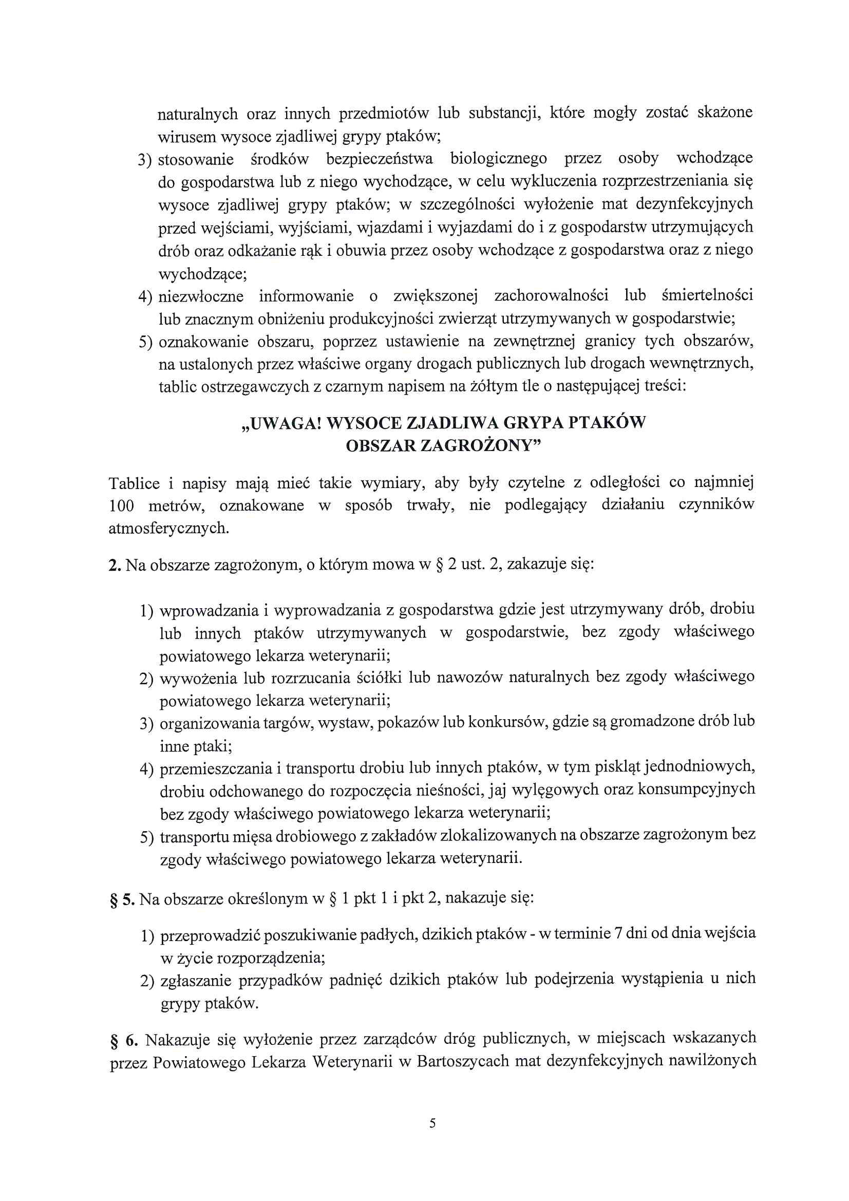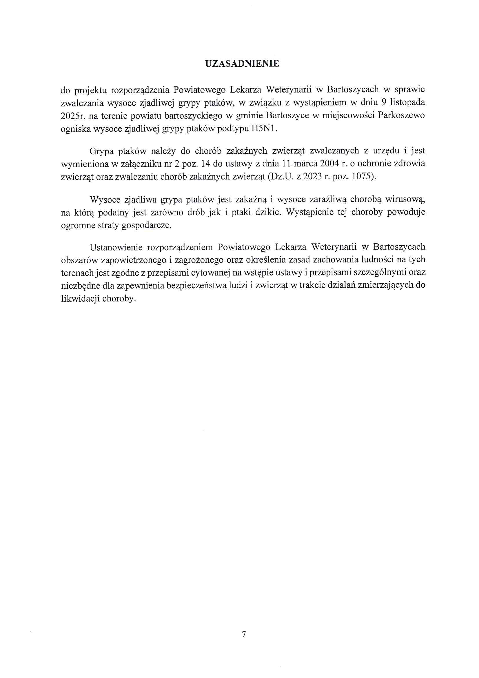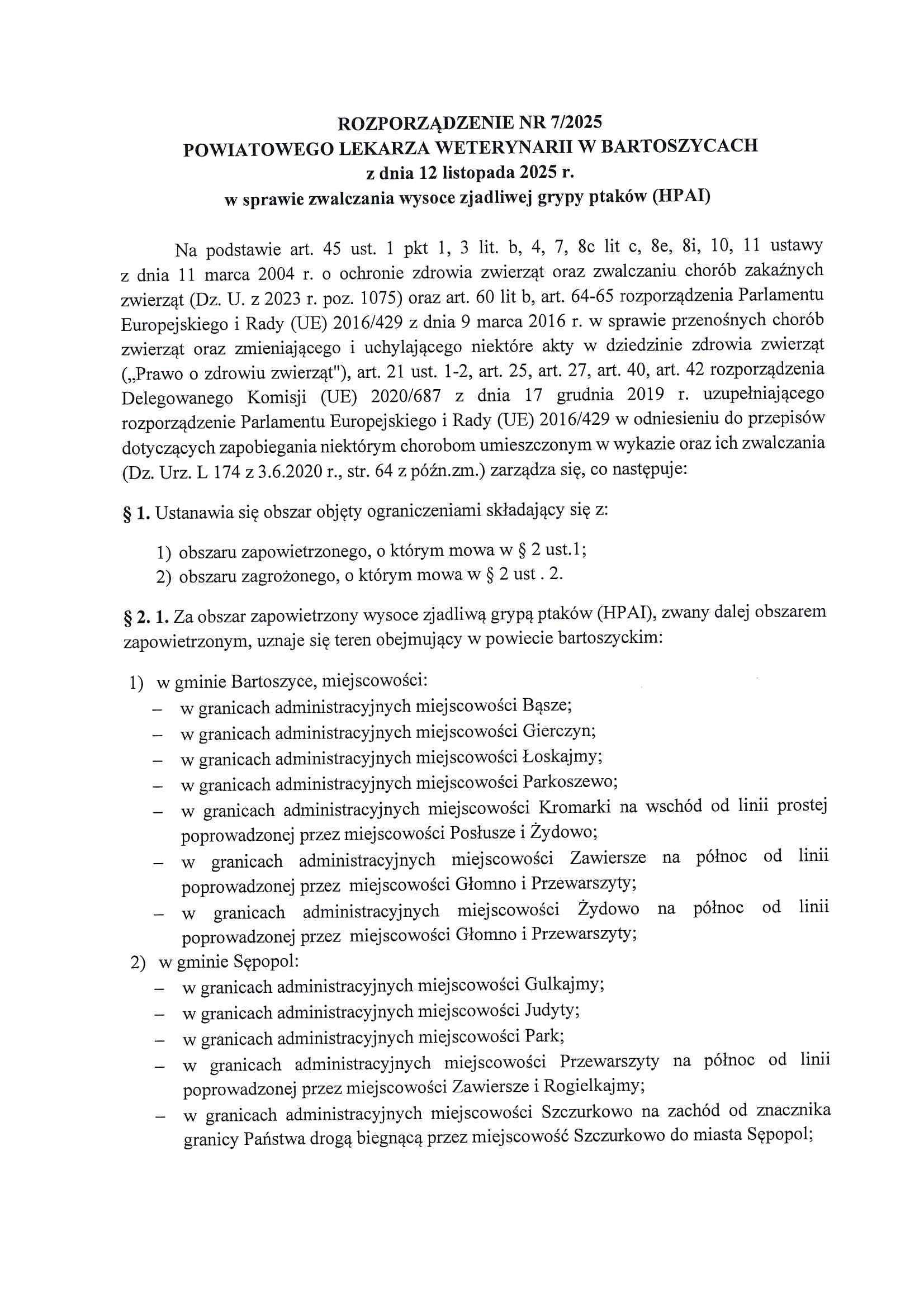 17 listopada br. do Urzędu Miejskiego w Sępopolu wpłynęła informacja od Powiatowego Lekarza Weterynarii w Bartoszycach, zawierająca rozporządzenie nr 7/2025 w sprawie zwalczania wysoce zjadliwej grypy ptaków (HPAI). W dokumencie wyznaczono obszary objęte restrykcjami oraz określono sposób postępowania w przypadku wystąpienia ogniska choroby. Treść poniżej.