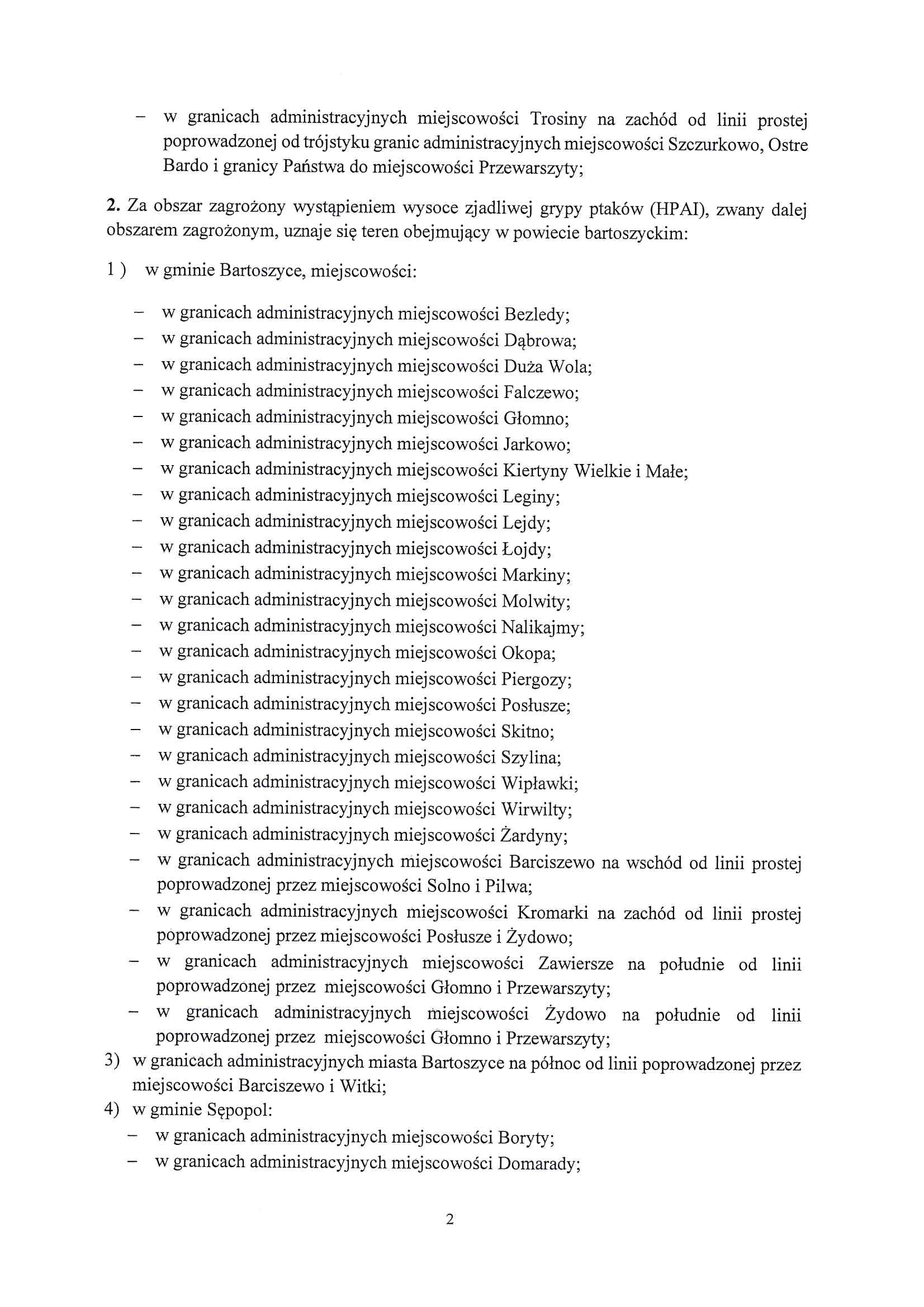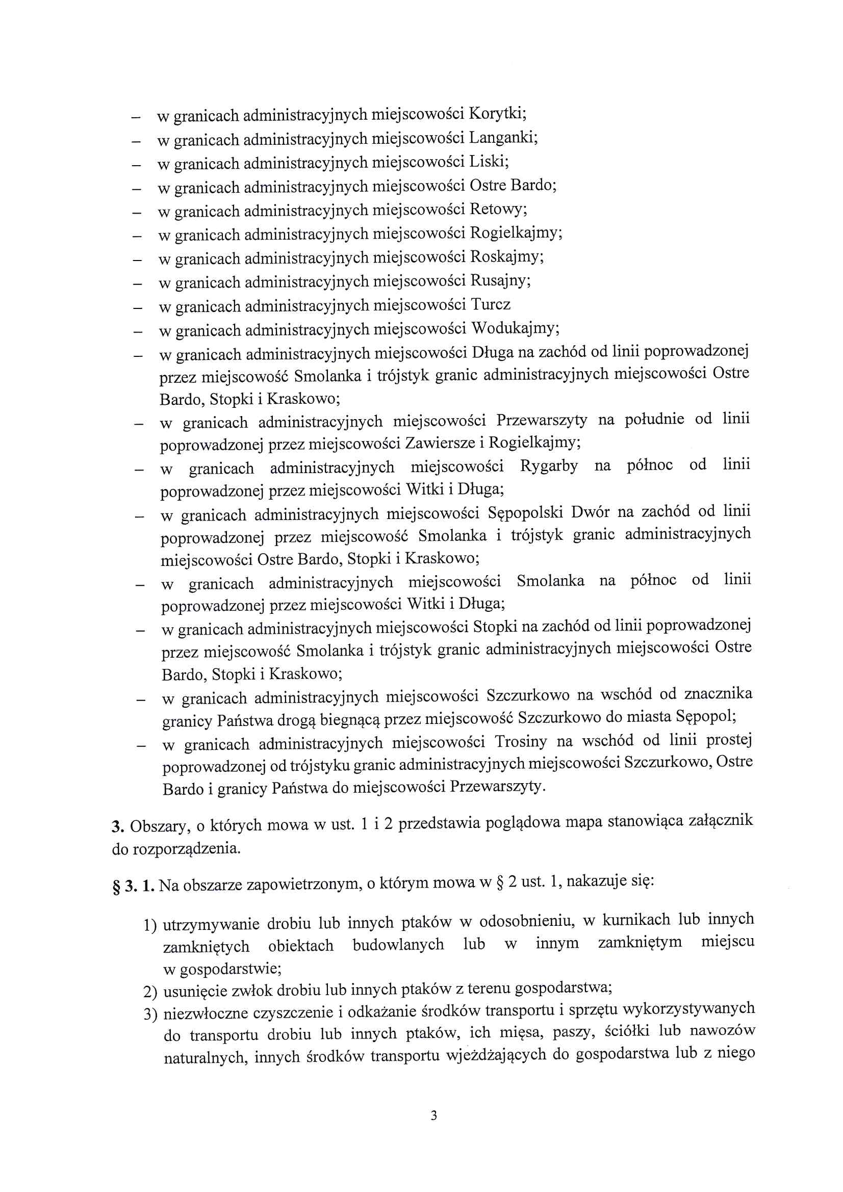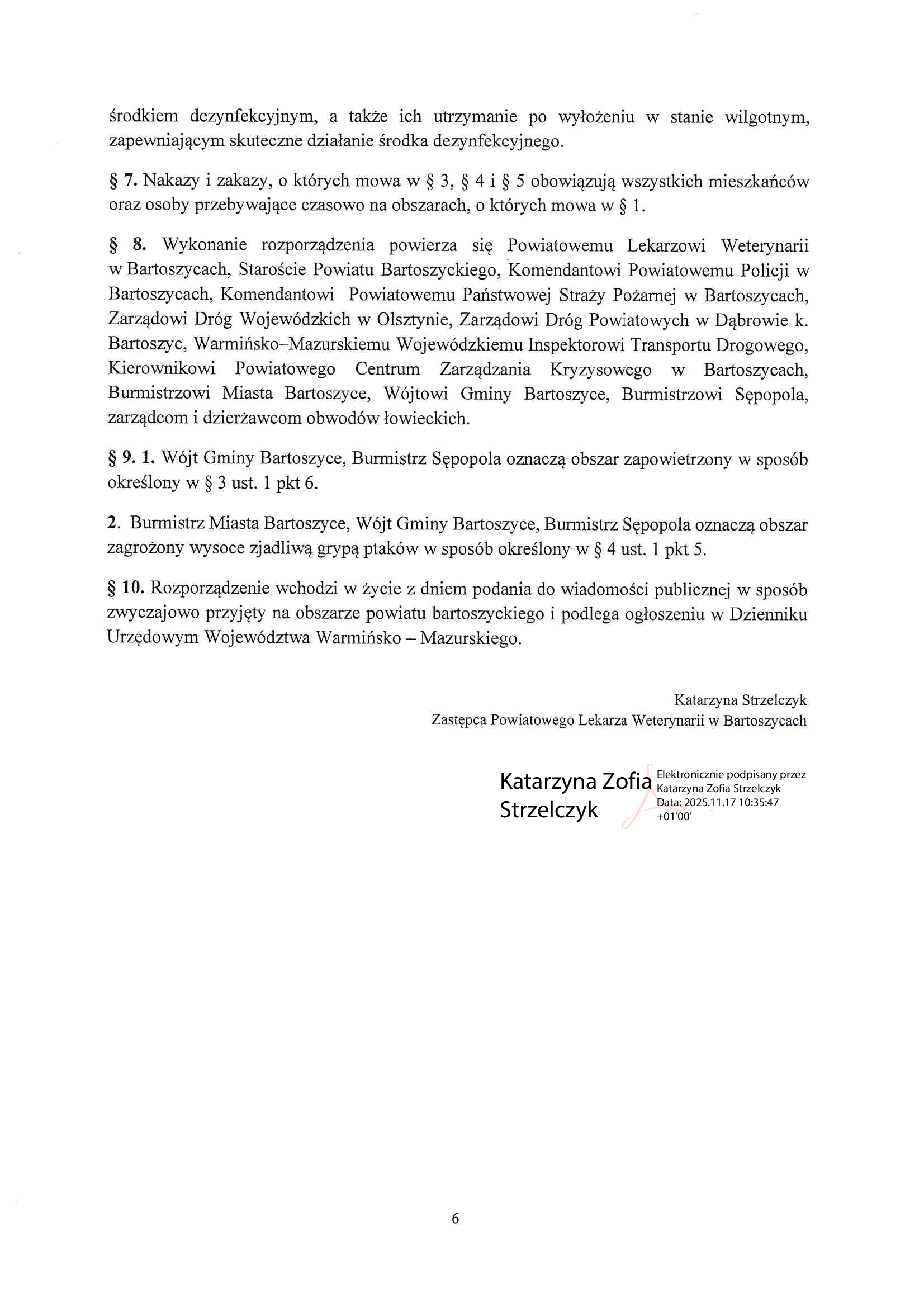 17 listopada br. do Urzędu Miejskiego w Sępopolu wpłynęła informacja od Powiatowego Lekarza Weterynarii w Bartoszycach, zawierająca rozporządzenie nr 7/2025 w sprawie zwalczania wysoce zjadliwej grypy ptaków (HPAI). W dokumencie wyznaczono obszary objęte restrykcjami oraz określono sposób postępowania w przypadku wystąpienia ogniska choroby. Treść poniżej.