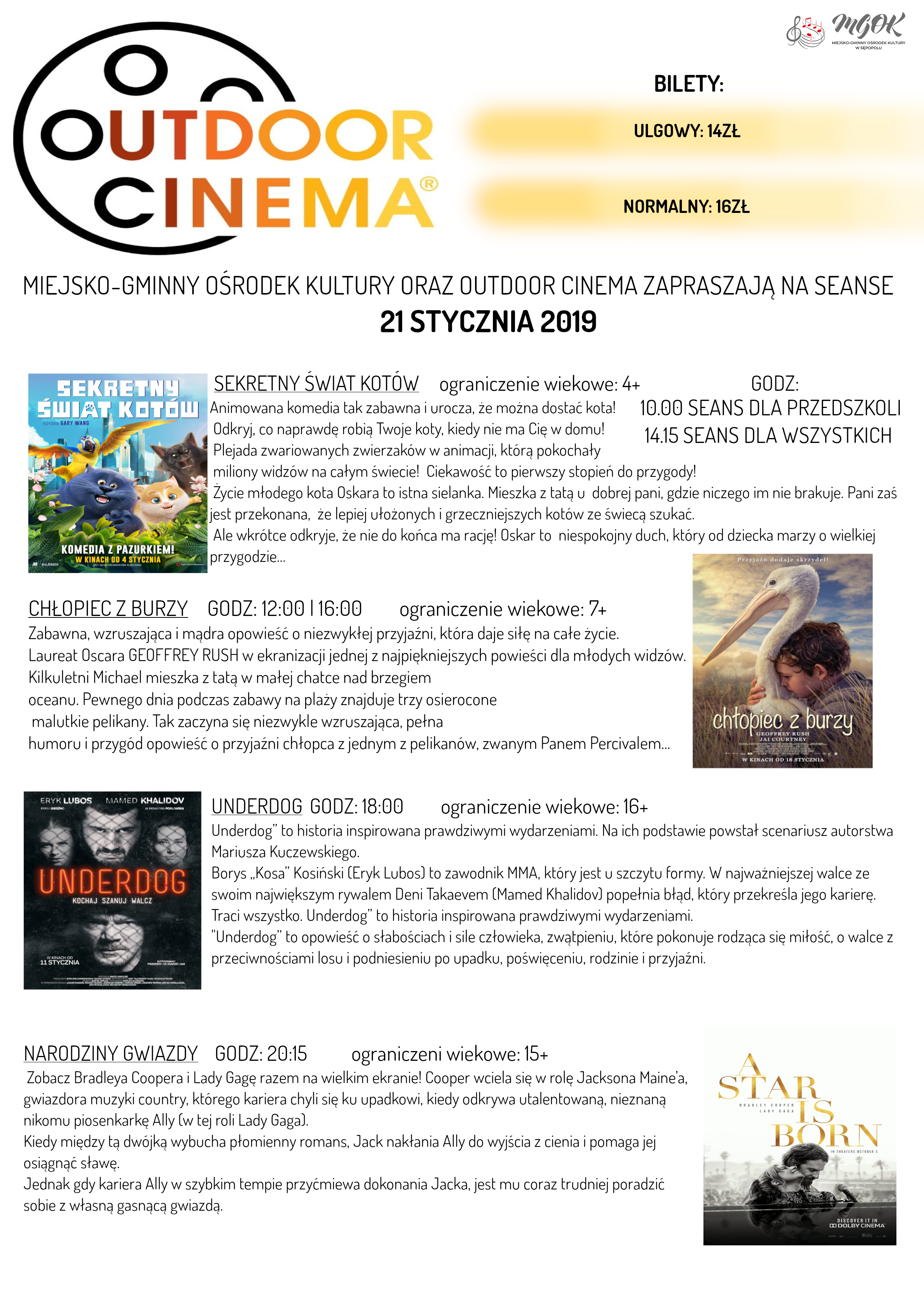 MGOK w Sępopolu oraz Objazdowe Kino Visa zapraszają na seanse w poniedziałek 21 stycznia już od godziny 10:00. Tego dnia będą wyświetlane 2 filmy familijne, historia inspirowana prawdziwymi wydarzeniami - "Underdog” i dramat muzyczny "Narodziny Gwiazdy".