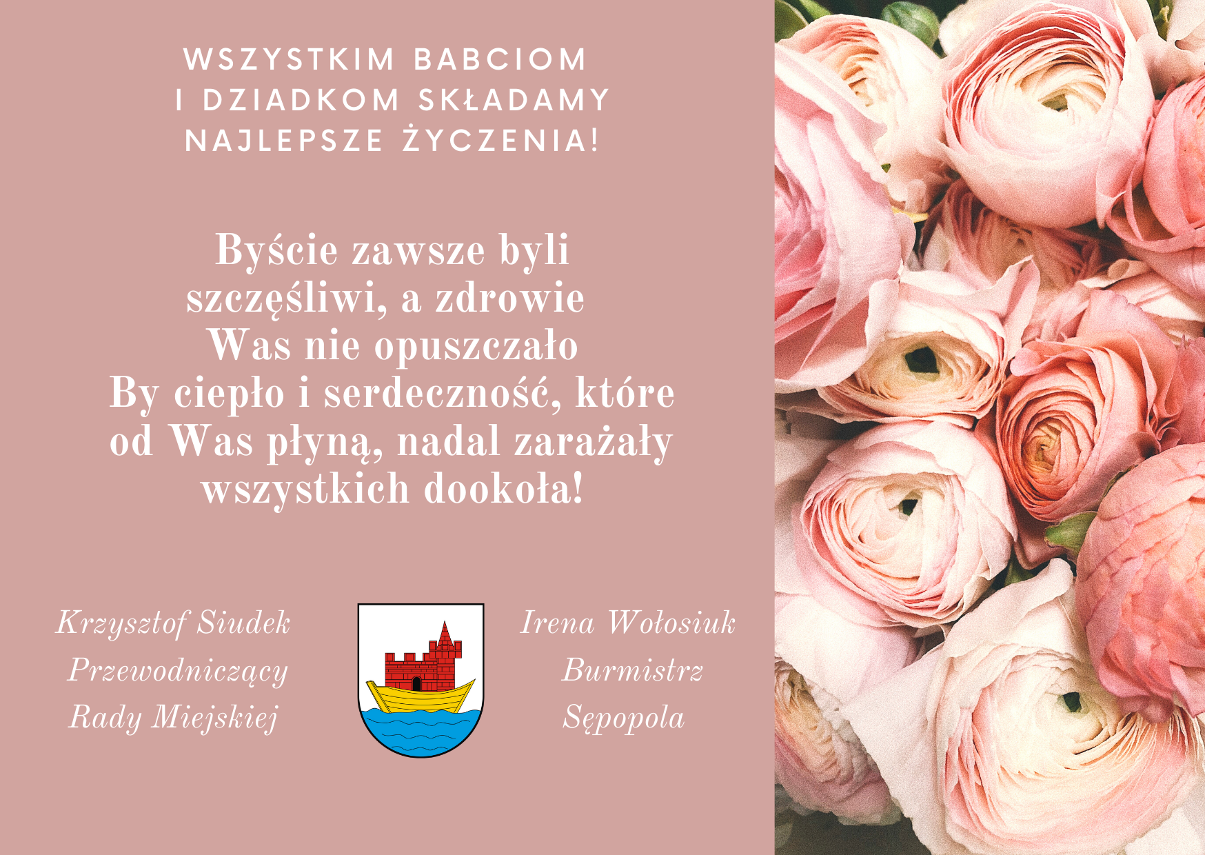 Babcie i dziadków – kochamy za zawsze otwarte i ciepłe serca. Nie sposób się z nimi nudzić. Dla wnucząt, są kopalnią mądrości i cennych rad. Burmistrz Sępopola Irena Wołosiuk z Przewodniczącym Rady Miejskiej Krzysztofem Siudkiem z okazji Dnia Babci i Dnia Dziadka przesyłają życzenia: