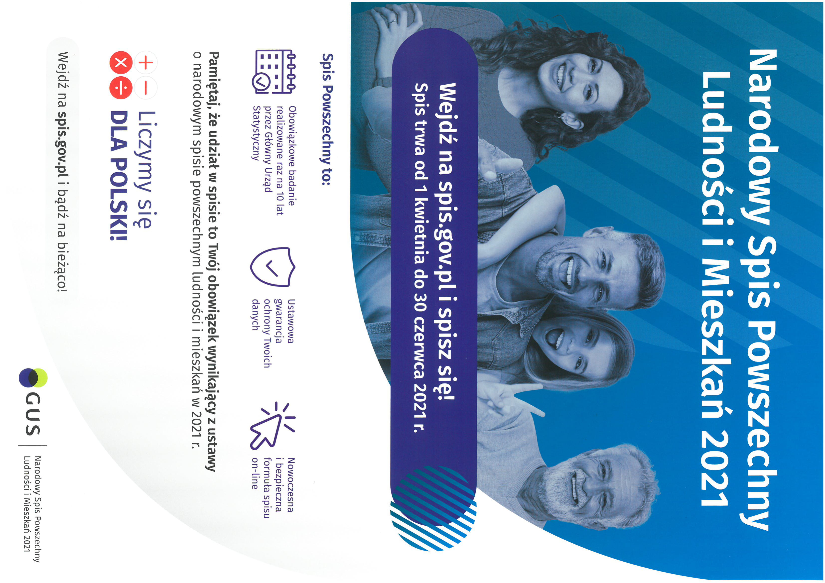 Od 1 kwietnia trwa Narodowy Spis Powszechny Ludności i Mieszkań 2021 (NSP 2021) czyli największe i najważniejsze badanie polskiego społeczeństwa. Spis jest obowiązkowy dla każdej osoby mieszkającej w Polsce. Zachęcamy do samodzielnego spisania się prze internet.
