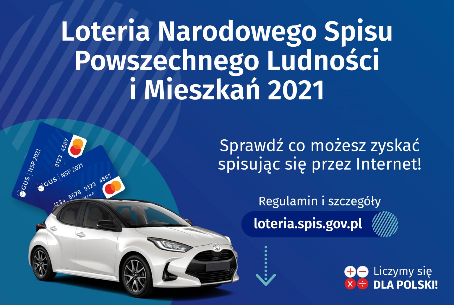 Serdecznie zachęcamy do udziału w loterii promocyjnej związanej z udziałem w spisie powszechnym. W loterii może wziąć udział każdy, kto samodzielnie spisze się przez Internet na spis.gov.pl. Zgłoszenia przyjmujemy już od 22 kwietnia 2021 r. Do wygrania są karty przedpłacone o wartości 500 zł, 1000 zł (nagrody I-ego stopnia), a w losowaniu finałowym, które odbędzie się 14 lipca – 16 samochodów osobowych!