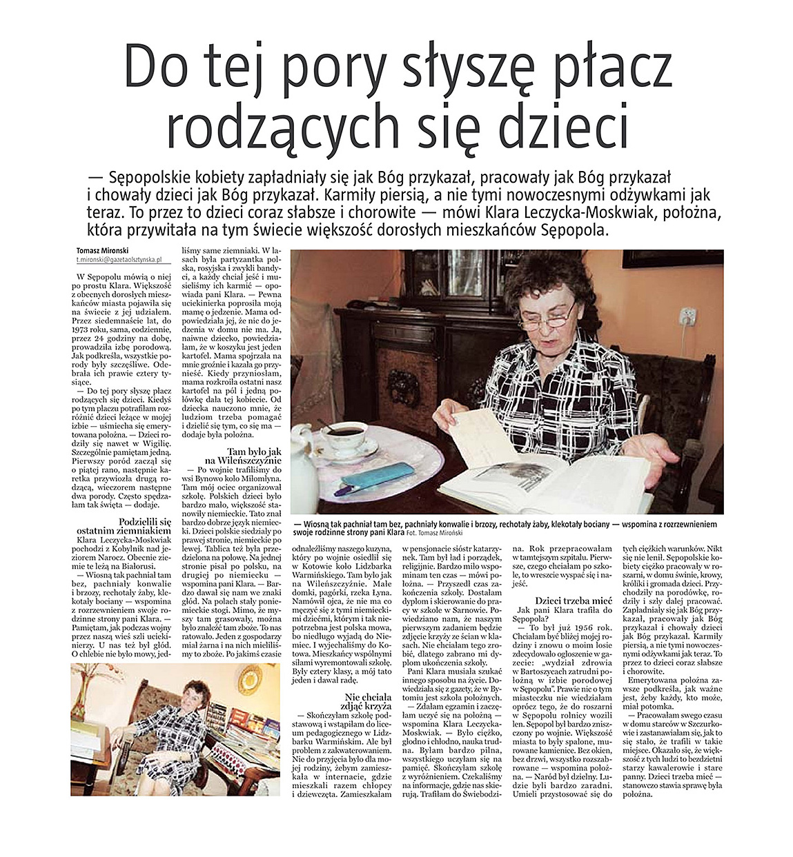 Z głębokim żalem zawiadamiamy, że 12 maja odeszła od nas Pani Klara Leczycka – Moskwiak – honorowy obywatel naszego miasta. Pani Klara była osobą niezwykle uczynną, otwartą, serdeczną. Urodziła się 1931 roku we wsi Michałowo na Wileńszczyźnie. Po wojnie mieszkała we wsi Bytowo koło Miłomłyna, następnie we wsi Bytowo pod Lidzbarkiem Warmińskim. Uczęszczała do liceum pedagogicznego w Lidzbarku Warmińskim, po ukończeniu którego skierowana została do pracy w szkole podstawowej w Sarnowie. Pracę w szkole zakończyła po tym jak wystąpiła w obronie krzyża, nie zgadzając się na usunięcie z klas lekcyjnych. Po tych wydarzeniach zdecydowała się zmienić zawód i podjąć naukę w Szkole Położnych w Bytomiu. Po jej ukończeniu z wyróżnieniem dostała skierowanie do pracy w Świebodzinie, a po roku trafiła do Sępopola. Pracę zawodową jako położna w Sępopolu rozpoczęła w 1956 roku i przez 17 lat prowadziła izbę porodową. W tym czasie odebrała 4438 porodów. Większość dorosłych mieszkańców naszej gminy, jest dziećmi urodzonymi w asyście Pani Klary. Po przejściu na emeryturę wykonywała obowiązki położnej środowiskowej w przychodni w naszym mieście. Uroczystości pogrzebowe odbyły się w Szczytnie, a na miejsce spoczynku wybrano cmentarz w Biskupcu.