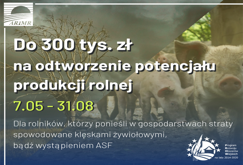 Rolnicy, którzy ponieśli w gospodarstwach straty spowodowane klęskami żywiołowymi bądź wystąpieniem afrykańskiego pomoru świń, mają czas do 31 sierpnia 2020 r., by złożyć wnioski i skorzystać ze wsparcia finansowego w ramach PROW na lata 2014-2020. O pomoc w ramach działania „Inwestycje odtwarzające potencjał produkcji rolnej” mogą ubiegać się rolnicy, którzy ponieśli straty spowodowane przez co najmniej jedną z następujących klęsk żywiołowych: powódź, deszcz nawalny, suszę, przymrozki wiosenne, ujemne skutki przezimowania, obsunięcie się ziemi, lawinę, grad, huragan, uderzenie pioruna. Ponadto o wsparcie mogą wnioskować rolnicy, którym powiatowy lekarz weterynarii nakazał, w drodze decyzji, zabicie świń lub zniszczenie zwłok świń w celu zwalczania ASF. Dotacje są dostępne dla tych, którzy ponieśli straty w roku, w którym jest składany wniosek o przyznanie pomocy lub w co najmniej jednym z dwóch lat poprzednich. Wysokość strat w uprawach rolnych, zwierzętach gospodarskich czy rybach uprawniająca do starania się o pomoc musi wynieść co najmniej 30 proc. średniej rocznej produkcji rolnej oraz straty te muszą dotyczyć składnika gospodarstwa, którego odtworzenie wymaga poniesienia kosztów kwalifikujących się do objęcia wsparciem. Wysokość poniesionych strat, jakie powstały w gospodarstwie, określa komisja powołana przez wojewodę. Natomiast w przypadku wstąpienia afrykańskiego pomoru świń o pomoc mogą ubiegać się rolnicy, którym powiatowy lekarz weterynarii nakazał zabicie świń lub zniszczenie ich zwłok w celu zwalczania ASF, a w dniu wydania tej decyzji stanowiły one co najmniej 30 proc. świń będących w posiadaniu tego gospodarza. Maksymalna kwota wsparcia, jaką można otrzymać, wynosi do 300 tys. zł, z tym że nie może przekroczyć ona poziomu 80 proc. kosztów kwalifikowanych. W przypadku wystąpienia klęsk żywiołowych, jeżeli zniszczony składnik gospodarstwa był ubezpieczony, wówczas wysokość pomocy pomniejsza się o kwotę odszkodowania uzyskanego z tytułu jego ubezpieczenia. Ponadto, jeżeli rolnik nie zawarł umowy obowiązkowego ubezpieczenia upraw, a będzie ubiegał się o pomoc na odtworzenie plantacji chmielu, sadów, plantacji krzewów owocowych gatunków owocujących efektywnie dłużej niż 5 lat, wówczas kwotę pomocy na odtworzenie tego składnika pomniejsza się o połowę. Dotację na pokrycie strat spowodowanych klęskami żywiołowymi można przeznaczyć na inwestycje odtwarzające zniszczone składniki gospodarstwa, np. na odtworzenie plantacji wieloletnich, sadów, odbudowę zniszczonych budynków czy zakup nowych maszyn lub urządzeń rolniczych. Z kolei rolnik, którego gospodarstwo zostało poszkodowane przez ASF, dotację może otrzymać na inwestycje, które nie są związane z produkcją świń. Wnioski przyjmują oddziały regionalne ARiMR. Można je składać osobiście, drogą elektroniczną lub rejestrowaną przesyłką pocztową.
