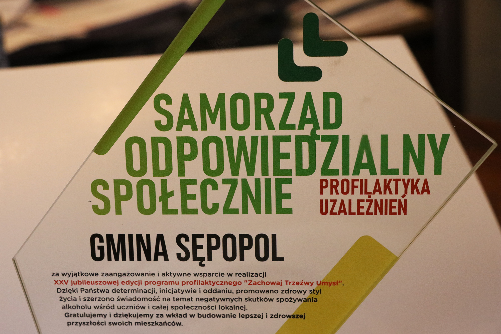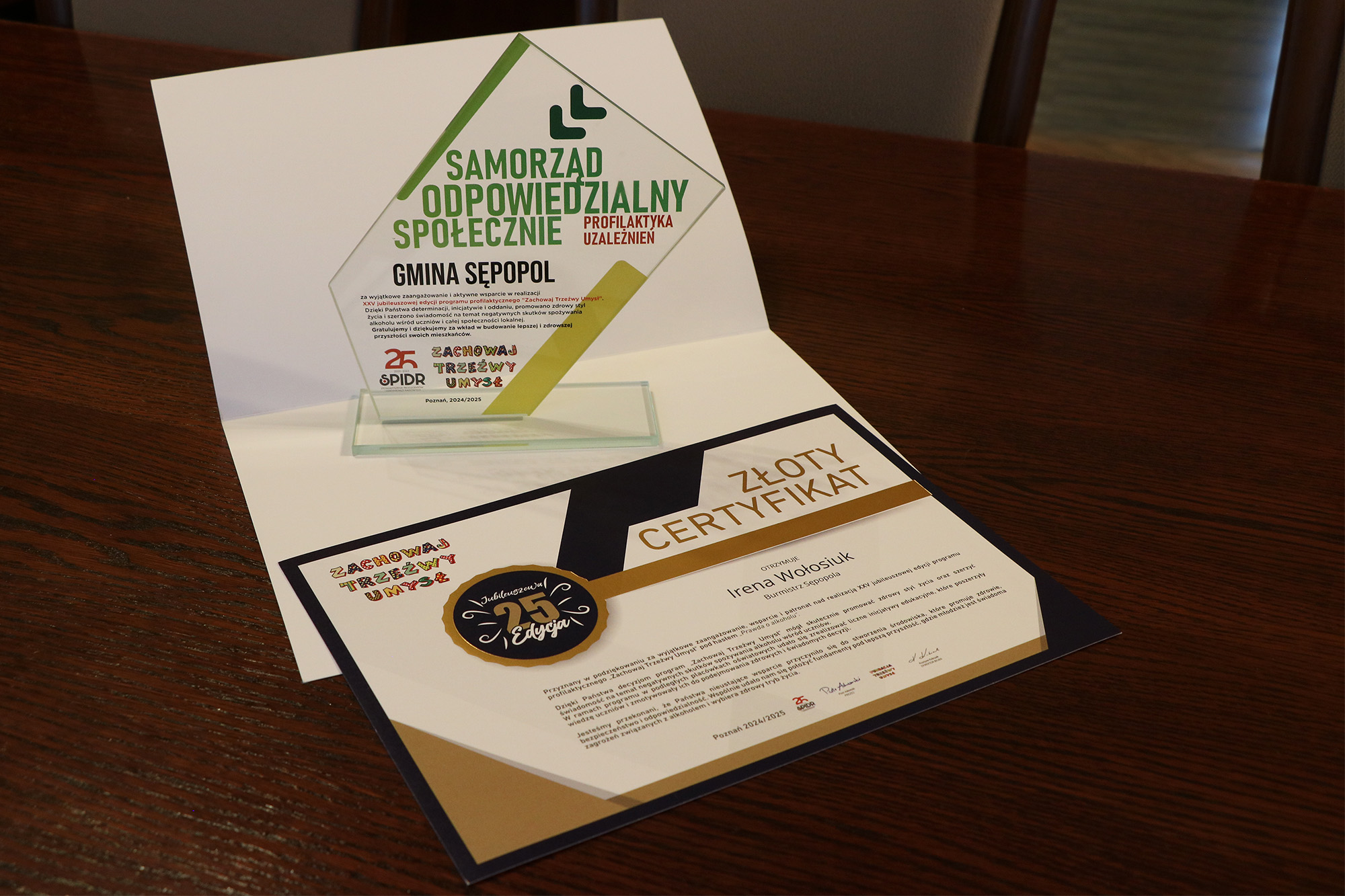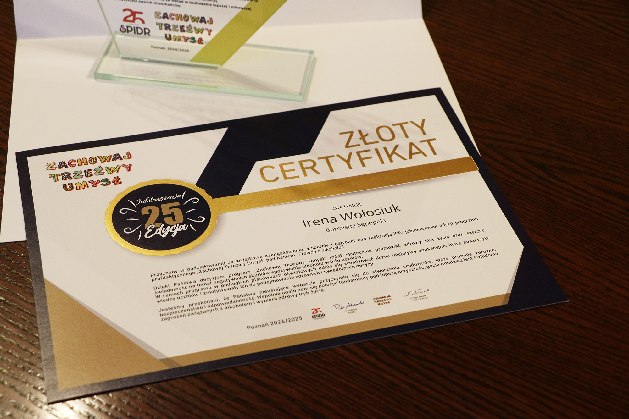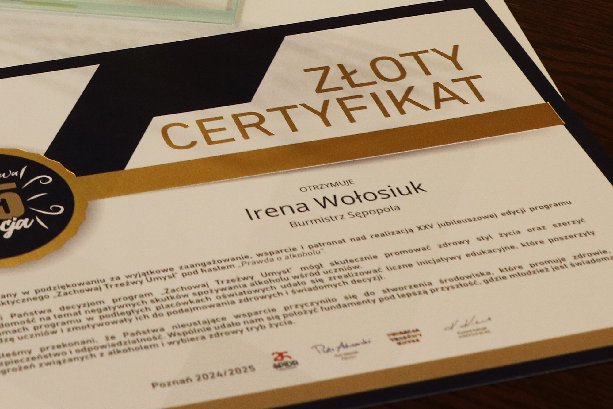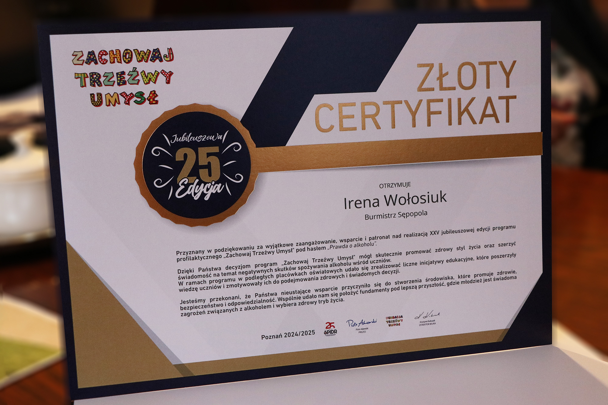 Z radością informujemy, że Burmistrz Sępopola, pani Irena Wołosiuk, została uhonorowana Złotym Certyfikatem w ramach 25. jubileuszowej edycji programu profilaktycznego „Zachowaj Trzeźwy Umysł” pod hasłem „Prawda o alkoholu”. Certyfikat ten przyznano w podziękowaniu za wyjątkowe zaangażowanie, wsparcie i patronat nad realizacją działań edukacyjnych mających na celu zwiększenie świadomości na temat zagrożeń związanych z alkoholem.