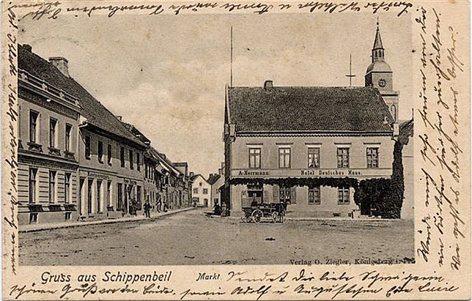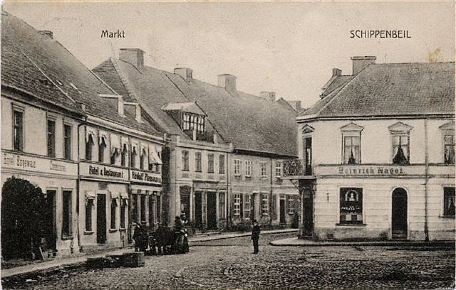 Nazwa miasta ulegała częstym niewielkim głównie fonetycznym zmianom. Nawa Schippenbeil pojawia się w opracowaniach historycznych z XVIII w i taka nazwa obowiązuje do 1945 r.
