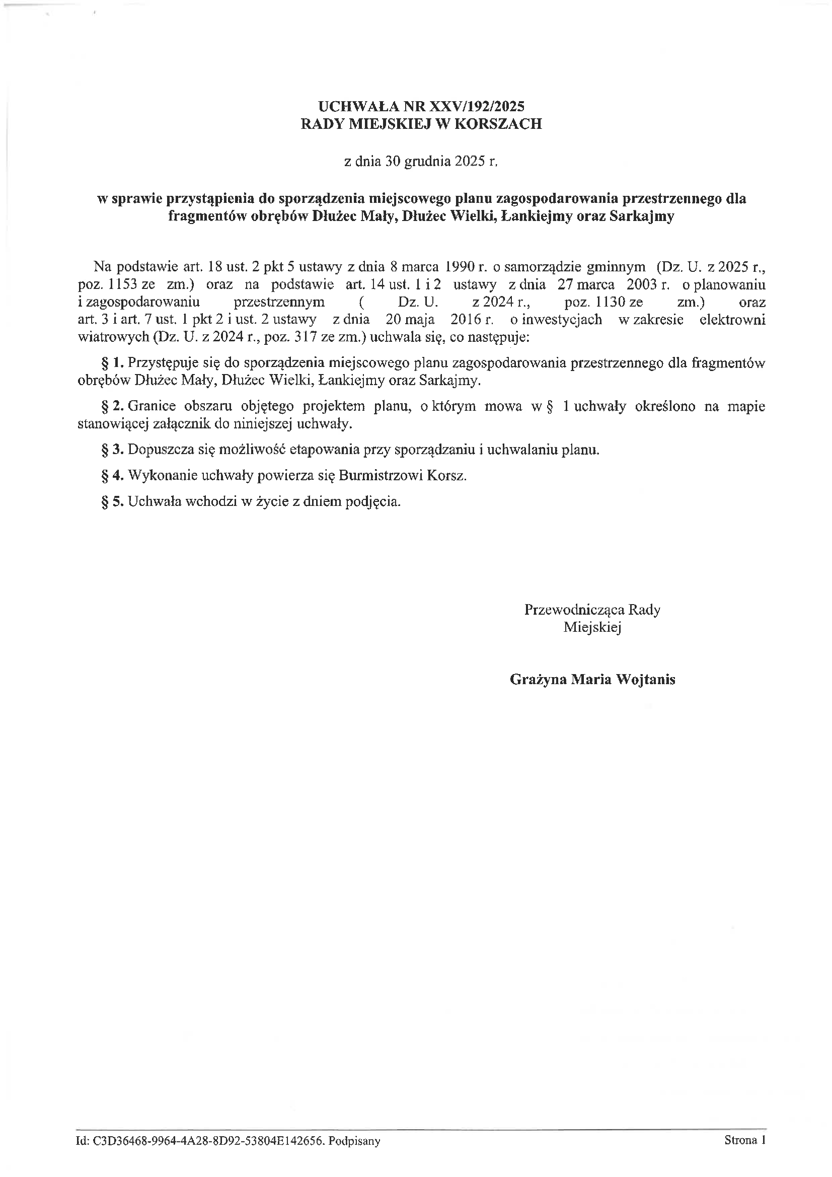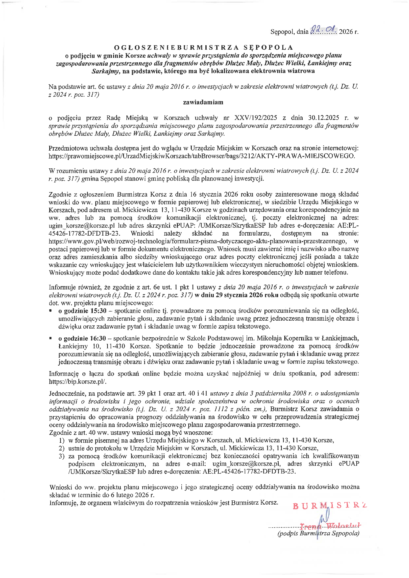 Ogłoszenie Burmistrza Sępopola o podjęciu w gminie Korsze uchwały w sprawie przystąpienia do sporządzenia miejscowego planu zagospodarowania przestrzennego dla fragmentów obrębów Dłużec Mały, Dłużec Wielki, Łankiejmy oraz Sarkajmy, na podstawie, którego ma być lokalizowana elektrownia wiatrowa.