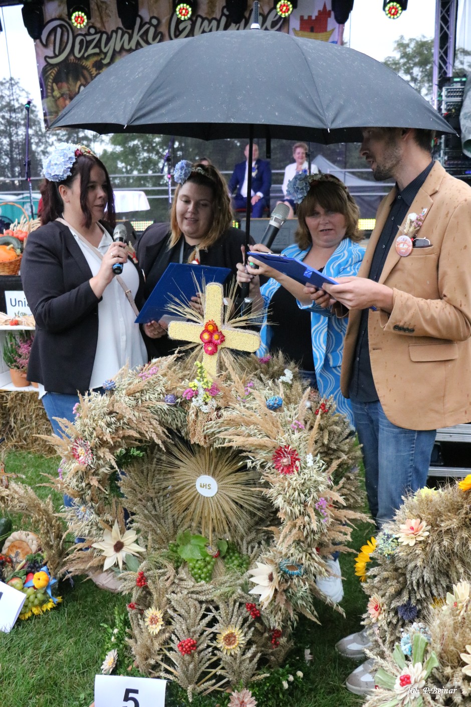 Następnie, zgodnie z tradycją, barwny korowód dożynkowy przeszedł ulicami miasta. Mimo padającego deszczu mieszkańcy dzielnie maszerowali z parasolkami, tworząc kolorowy i radosny pochód, który dotarł na Stadion Miejski, gdzie kontynuowano obchody.
