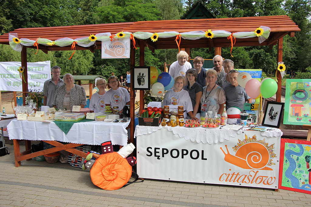 Podczas festiwalu prezentowaliśmy nasze walory regionalne oraz kulinarne. Gościom odwiedzających miasteczko cittaslow serwowaliśmy własnoręczne wyroby w postaci pierogów, miodów, syropów, ciast i ciasteczek, drożdżowych ślimaczków przygotowanych przez sekcję kulinarną działającą przy UTW w Sępopolu. Dodatkowo eksponowaliśmy miód, woskowe ślimaczki, prace plastyczne wykonane przez seniorów z UTW a także materiały promujące naszą gminę.